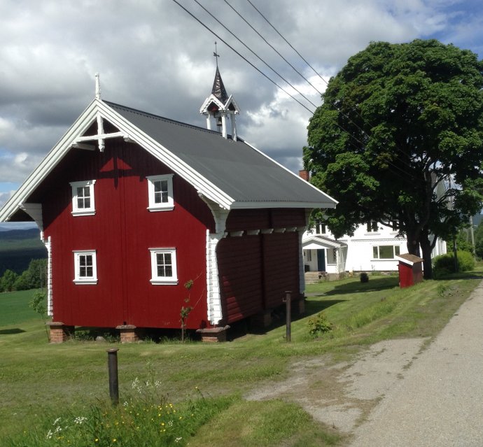 Granavollen is een mooi plaatsje met veel bezienswaardigheden oa het oudheidkundig museum, de twee kerkjes, een kunstcentrum. Bij een hotel nemen we plaats op een klein terrasje. Bestellen wat te drinken (prijs valt ontzettend mee) en genieten. Maar we hebben beiden ook de piep oet. Ich dink det die Ruiverse piep zellefs laeger is as die Ieslandse. Dan zien we Thomas komen aanlopen. Nog steeds slepend met een te zware rugzak in mijn ogen. Maar het gaat prima, zegt hij. Het is ook een aardige sterke kerel. En hij is jong. Afgelopen nacht had hij zijn tentje opgeslagen aan het Randsfjord bij de Slovika camping. Nu loopt hij tot Brandbu. We kletsen heel wat af, bezoeken het kunstenaarscentrum en kerk en krijgen bij het pelgrimscenter van Granavollen een mooie stempel. Dan wordt het tijd voor de laatste vier km naar Tingelstad. Tegen kwart over vier zijn we er. Beiden heel erg blij na 26 km "Keutebergen"