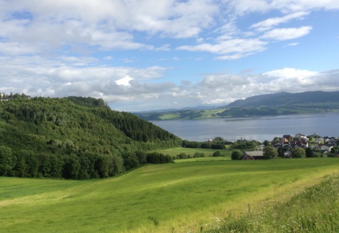 Morten heet ons hartelijk welkom in zijn zeer oud huis. Gedateerd uit 1686. Sinds 1993 in zijn bezit en gekocht voor 5000 Noorse kronen. Ongeveer 500 euro. Voor de hele inhoud van het huis, alles meer dan 200 jaar oud, heeft hij 100000 kronen betaald. Ongeveer 10.000 euro. Binnen valt ons beiden de mond open. Je weet niet wat je ziet. Hij is aan het koken voor ons, op een groot, heel oud houtgestookt fornuis. Eine lekkere geur verwent al os sjmaakpapille. Zeker als ik een aardig stuk zalm zie liggen. Nadat Morten ons de slaapplekken heeft gewezen, kan ik als eerste onder de douche. Dat doet goed. Det lekker ieskaad Noors water, met ein bietje werm der biej. Mijn loopspullen was ik nog even uit want buiten schijnt de zon nog volop. Om zes uur zitten we gedrieën aan tafel. Het eten smaakt voortreffelijk. We overladen hem dan ook met complimenten. Onder het eten vertelt Morten ons dat wij de eerste pelgrims zijn, maar voor dit jaar ook de laatste. Voor zijn werk gaat hij lange tijd weg. En zijn werk is zijn grote liefde. Hij werkt voor musea als restaurateur van oude schepen. Na het eten drinken we buiten nog een lekker pilsje en luisteren naar de verhalen van onze bevlogen scheepsrestaurateur. Wat kan hij boeiend vertellen en wat kan ik het gelukkig allemaal redelijk goed volgen. Zo mijn was is droog en ik ga mijn verhaal schrijven van deze geweldig mooie dag. De regio waar we nu lopen wordt ook wel de Toscane van Noorwegen genoemd. Hoije.