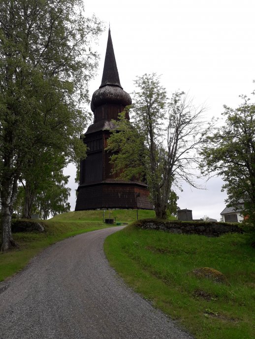 Negen uur is het geweest en eindelijk zijn we nu echt op pad. Als we het kleine Ändsjön natuurreservaat inlopen worden we getrakteerd op een vogelconcert. Het is een waar vogelparadijs. Jammer dat we door de nattigheid niet tot bij het water of de uitkijkposten kunnen komen. Hier zitten niet minder dan 90 vogelsoorten. En paar noem ik er: roodkeelduiker, goudplevier, ruigpootuil, visarenden, grauwe franjepoot. Door een mooi bosgebied komen we uit bij de Frösö kyrke. Hier houden we in de kerk een langere pauze. Ook bij deze kerk weer een bijzondere houten alleenstaande toren. Hij straalt iets mystieks uit. Door deze toren is het hier een geliefde plek om te trouwen. Binnen in de kerk een prachtig oud houten beeld van de heilige Olaf. Fijn dat deze kerk open is.
