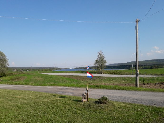 Bij Bleckåsen staat een gedenksteen voor de vredesonderhandelingen van 1809. Denemarken - Noorwegen en Zweden waren verwikkeld in een van de Napoleontische oorlogen. De Denen waren op Skåne uit en de Zweden op een del van Noorwegen. Hierbij Bleckåsen werd de wapenstilstand gesloten. Tevens is hier een stempel. Als we hier even zitten komt tot onze verrassing Birger aan gereden. Hij wilt ons hier nog vanalles over vertellen. We luisteren even en dan gaan we toch verder. We hebben tenslotte nog zo'n 12-13 km te gaan. Deze weg is een verschrikking. Niet dat er veel verkeer op is maar de venijnige hellingen en de lengte. Verrast worden we als we af en toe van deze weg het bos ingestuurd worden. Smalle paadjes parallel aan deze weg zijn een genot. Lekker in de schaduw en het is en genot om deze te lopen. We höbbe al genöch asfalt gehad vandaag. Mooi plekken om te pauzeren zijn er gelukkig genoeg in het bos. Uiteindelijk komdn we om half vier aan in Mörsil bij de supermarkt. Voor vanavond moeten we nog wat eten kopen. Hier pauzeren we ook een tijd, omdat we niet voor vijven binnen kunnen op onze slaapplek. Deze is in een huisje op het erf van de priester hier, Kerstin Strömberg. Als we hier tegen half vijf aankomen, hangt buiten aan de weg de Nederlandse en IJslandse vlag al te wapperen. Hartelijk worden we hier ontvangen door Kerstin en Anne-Marie. Ze verteld het een en het ander binnen en dat de Wi-Fi code op tafel ligt. Maar ze verteld er ook bij dat de Wi-Fi buiten werk direct bij haar huis wat 30 meter verderop ligt. Tegen zessen eten we onze magnetron maaltijd en ik merk dat ik behoorlijk moe ben. Onze was is intussen ook droog en dat is meegenomen met deze warmte. Vanavond op tijd naar bed en hopen maar dat we een beetje slapen. Aan de "middernacht zon" wen ik nooit. Om elf uur s'avonds gaat ze onder en om drie s'morgens komt ze weer op. Sjlaop ze.