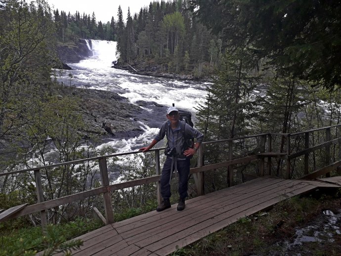 Ongerwaeg hebben we Larry uit California ontmoet. Ook hij verblijft hier. Het is zijn eerste wandeldag. We hebben lekker gegeten hier. Alles stond klaar in de koelkast inclusief ontbijt voor morgenvroeg. Voor elk een portie. Wat een service. Voor het avondeten bezoeken we gedrieën de Tännforsen, de grootste waterval van Zweden. Wat een natuurgeweld, wat een kracht en schouwspel. Sjlaop ze.