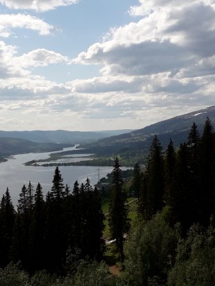 Ongerwaeg als ik zit te pauzeren komen John en Rùna aangereden. Ze stoppen even en vragen of alles goed gaat. Jazeker ik ben net van plan om weer op te stappen. Eenmaal weer onderweg kom ik langs 2 mooi gelegen meren:het Byavatnet en Sottjønna meer. Ik loop hier over een schiereiland dat in het Trondheimfjord eindigt. Sjoeën det de reagen is opgehaaje. De weg blijft op en neer gaan en is geen moment vlak. Uiteindelijk kom ik uit de bossen en zie voor me het hele grote Trondheimfjord. Ik pauzeer nog even, kijk op 'Mary' waar ik ergens zit en hoeveel km er nog zijn te lopen tot aan de slaapplek. Dan krijg ik een berichtje van Rùna of ik haar wil bellen. Als ik bel vraagt ze waar ik ergens ben. Zij denkt n.l dat ze de herberg al voorbij is.