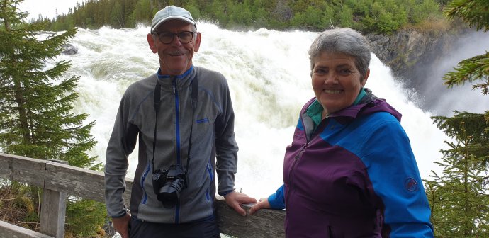 Op een stuk rots staat een tekst: Du är Älskad (jij bent geliefd). Hierna steken we de E14 en het spoor over en dalen af naar de rivier Indalsälven. Waar we een absoluut hoogtepunt gaan bekijken n.l de: waterval Ristafallet. Bij het naderen, horen we al het geweld. Over een mooi paadje lopen we langs de rivier richting dit geweld. Wat een kracht zal het water wel niet voortbrengen. Mijn camera maakt overuren. kniIch weit neet waor ich ut iërs mòt kiëke of mòt knippe. Langzaam naderen we de waterval zelf. Het hoogtepunt. Oh my God, zeg ik tegen Rùna. Wat een geweld aan water dat zich hier 15 meter omlaag stort. Ik geniet er van, zo'n natuurgeweld waar je bijna met de neus in staat. Dan slaan we links een bospaadje in naar de Camping. Trouwens de route onder langs dit spektakel is gemerkt met schelpen. Bij de camping aangekomen lopen we naar de receptie. Hartelijk worden we welkom geheten door de dochter van de Nederlandse eigenaar. We drinken eerst ons aankomstpilske en we kunnen ook vanavond hier eten. Een mooie hut krijgen we, tevens de code voor de sanitaire voorzieningen. Mooi dat deze vlak naast onze hut ligt. Na onze dagelijkse 'things to do' gaan we terug naar het restaurantje om ons schrijfwerk te doen onder het genot van een lekker bakkie koffie. Dit is het voor vandaag. Geur sjtrakkes, sjlaop ze.