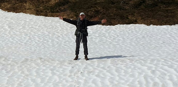 Zo zitten we bij Birger Bjornfot buiten tussen de rommel aan de koffie. Van oorsprong komt hij uit het grensgebied Lapland, Zweden, Finland. Hij praat een mengelmoes van wel drie tot vier talen dooreen. Zweeds, Duits, Engels en Fins. Helemaal alleen woont hij hier en is 79 jaar. Hij laat ons vanalles zien, vooral een van zijn huizen waar we zelfs kunnen blijven slapen zegt hij en ook nog voor niks. Maar bij het zien van dit huis uit 1680!! Bedanken we er voor. Wat een janboel, waat eine kraom. We vertellen hem maar snel erbij dat we vanavond in Mörsil slapen. Maar dat is nog ver zegt hij. Dan komt hij aangelopen met een hele map met papieren, foto's en brieven. Allemaal van pelgrims die hem iets gestuurd hebben. Bij zijn zitje is een mooi bloemperkje met een wit kruis erin. Aan dat kruis hangt een foto waar hij op staat geknield bij een grafsteen. Hij braselt wat, maar ik denk dat dit het graf is van zijn overleden echtgenote. We komen er niet achter. Hij laat foto's zien van pelgrims uit alle continenten die hem deze hebben gestuurd. Ook wij gaan met hem op de foto. Ik stel mijn camera op automatisch in over 10 seconden. Met Rùna in het midden knippen we een mooie foto en geloven hem deze op te sturen. Dan wordt het tijd dat we opstappen, maar hij wilt ons nog vanalles laten zien. Vooral zijn eigen gemaakte sauna. Kunnen we uitproberen zegt hij. Och Birger, ut is al heit genóg boeëte. De rugzak gaat op de poekel en dan nemen we afscheid van deze zonderling denk ik. God wiej helse ut hiej oët. Als we op die eindeloze weg uitkomen denken we beiden van: och waas ich mer biej mooder thoes geblaeve.