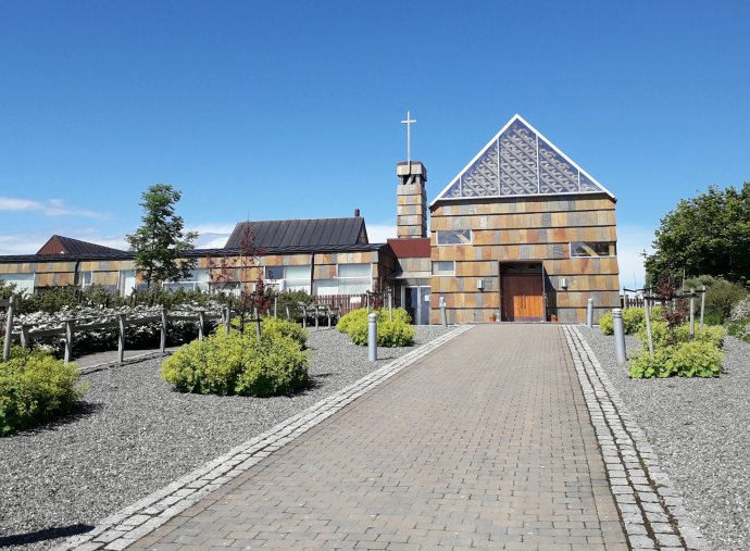 Good gepit vannach op dees sjoeëne plek. Dae angere Olav haet 't good veur mekaar hiej. Runa is in de keuken al wat eitjes aan het koken. Ik ga eerst naar mijn schoenen kijken. Olav heeft me gisteren een plek gewezen waar ze zeker zullen drogen. Ze staan daar n.l. op een warmte verdeler. Inderdaad ze zijn helemaal droog. Geliek doon ich ze weer aan mien 'dancing shoes'. Aan het ontbijt bekijk ik de route voor vandaag nog eens. Mayby Ger you can find a shorter way. Nou dat lukt ook wel. Ik hoop voor Runa dat het voor haar gaat lukken om dit stuk helemaal te lopen. Maar zoals ze zelf zegt: its better to walk, then I got not so much problems. Vanmorgen toen ze opstond dacht ik, dit gaat het niet worden vandaag. Maar zoals ik al eerder heb geschreven, het is een eerste klas doorbijter. Gisteravond zei ze nog: I will arrive to Nidaros by foot! Kwart over acht gaan we. Het zal een etappe worden over voetpaden en fietspaden. Veel heb ik niet te schrijven van ongerwaeg vandaag. De weg loopt veel door buitenwijken en soms door een industrieterrein. Bij de Rannheim kirke houden we even een korte stop. Helaas is de kerk dicht.