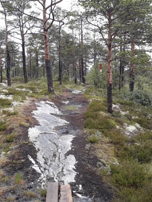 Vandaag volg ik voor de laatste keer bospaden of wat er voor door moet gaan, door het veenmoeras. Naar men zegt zijn dit oude kerkepaden die door de bewoners van Mostardmarka werden gebruikt vroeger om naar de kerk in Malvik te gaan, wat trouwens een flinke tippel is. Ik kan me dit haast niet voorstellen, zo'n gesjravel door dit veenmoeras. Als ik hieraan begin, heb ik na 50 meter al het water in de schoenen staan. Wat is het hier nat, ongelooflijk. Werkelijk ik ploeter vooruit, omhoog, omlaag, over planken en door het gedrenkt mos. Uit kijken is het, vooral voor de rotsplaten en wortelstronken welke soms verradelijk glad zijn. Steeds gaat het op en neer. Ondanks natte voeten, regen, barre paden en weet ik wat nog meer, geniet ik. De natuur om me heen is fabelachtig mooi. En wat kan stilte mooi zijn. Hier hoor je de 'sound of silence'. Ik kom uit bij het Nyvatnet meertje met een mooie picknick plek. Mer gank in de raegen mer ens picknicken.