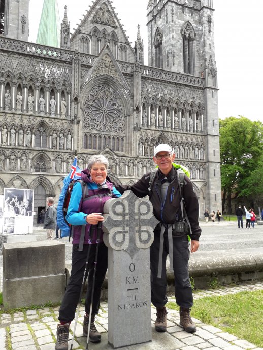 Achter Rannheim korten we de route af wat Runa heel goed vindt. Hoe moeizaam het ook gaat, ik bewonder haar vastberadenheid om te voet aan te komen. Langzaam naderen we Trondheim. Ongerwaeg sjuule veur nog veur ein fikse raegenbuuj. Och wat maak det oët. Als we Trondheim binnenlopen en een eerste blik krijgen op de Nidaros dome worden we een beetje euforisch. Yes, yes, zegt Runa, we did it again. Als we bijna bij de Dom zijn, spreekt een jongeman mij aan. Hij vraagt enthousiast of we op de Olavsweg zijn. Ja dat zijn we. Waar zijn jullie gestart vraagt hij. Runa vertelt hem dat we in Selanger in Zweden zijn gestart. Zo, jullie hebben de hele weg gedaan! Ja dat hebben we. Bij de Lade kirke slaan we links af en dan zijn we er bijna. Als we de Gamle Bybro oplopen treffen we Danielle nog. We praten even en dan rap de brug over naar de Dome. Half een staan