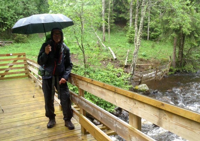 Ik had voor mijn pelgrimstocht een klein lichtgewicht stormvast parapluutje gekocht. Het heeft zijn diensten al bewezen. En het belangrijkste, de glazen in mijn bril blijven droog en beslaan niet. Een paar uur lopen we door. Het is moeilijk om een droge plek te vinden voor onze boterhammen op te eten. Beiden zijn we moe, hebben honger en zijn nat. Tegen half twee, we hebben dan drie uur gelopen, zien we een jonge man buiten in de regen met een aanhanger klooien. Ik roep hem en vraag of we onder de veranda voor het huis ons brood mogen opeten. Hij stelt zich voor als Ole-Johan en zegt dat het zijn ouderlijk huis is. Hij neemt ons mee naar de veranda en dan staan pa en ma ook zo buiten. Nieks onger de veranda, mét nao binne. Maar eerst doen we onze natte spullen inclusief de schoenen uit. Ole-Johan stelt zijn vader en moeder aan ons voor: Ole en Berit. Van een oude kachel komt de gloed vanaf. Det veult lekker aan. Daar zitten we dan met de familie aan de grote keukentafel in het gehucht of plaatsje Tandsæther. De koffie staat te pruttelen. Een schaal met eigen gebakken koekjes komt op tafel. Ongelooflijk wat zijn dit lieve mensen. De moeite die ze zich nemen om met ons te communiceren. Ole spreekt geen Engels. Zijn vrouw een beetje. Maar fijn is het dat Ole-Johan het wel spreekt.En Runa spreekt geen Noors maar kan het wel wat verstaan. De koffie is heerlijk en vol enthousiasme vertellen ze dat ze hopen het volgend jaar hun 50 års ekteskap (gouden bruiloft) te vieren. Ze stralen gewoon. Het ontroerd me. Meer dan een uur zitten we hier. Wat hebben we genoten van deze fantastische ontmoeting in hun huis aan de keukentafel, met Ole en Berit en hun zoon Ole-Johan. Aan de zoon vraag ik nog of hij weet waar Holte Gård ligt. En dat weet hij. Ik laat hem de route zien op mijn GPS en hij wijst me het punt aan waar we de route moeten verlaten. Rechtsaf hier, zegt hij en dan kom je er van zelf. Een hartelijk afscheid volgt. We trekken onze regenkleding weer aan en gaan verder.